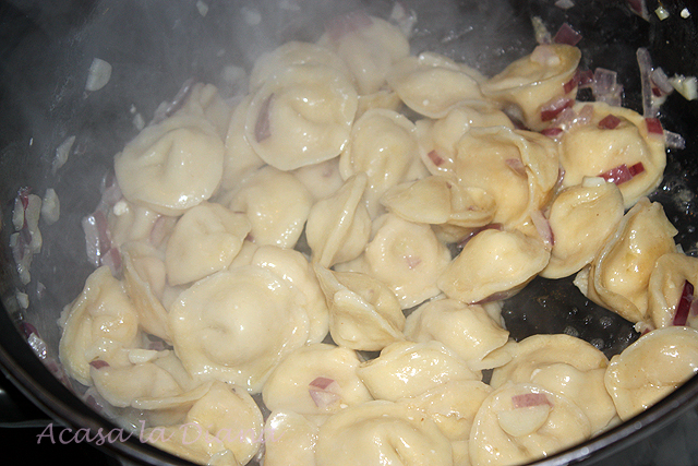 Am pus apa cu sare la fiert,cand a inceput sa clocoteasca am pus tortelinni si i-am lasat pana s-au ridicat la suprafata.Intre timp am pus si o ceapa si un usturoi la calit in putin unt,am adaugat tortellini gata fierti,am stins cu o smantana pentru frisca(200 ml parca are cutiuta) si am mai lasat sa dea vreo doua clocote,apoi am mai adaugat restul ce branza ce-mi ramasese de la umplutura,mai niste mozzarella;am potrivit de sare,piper si am servit.